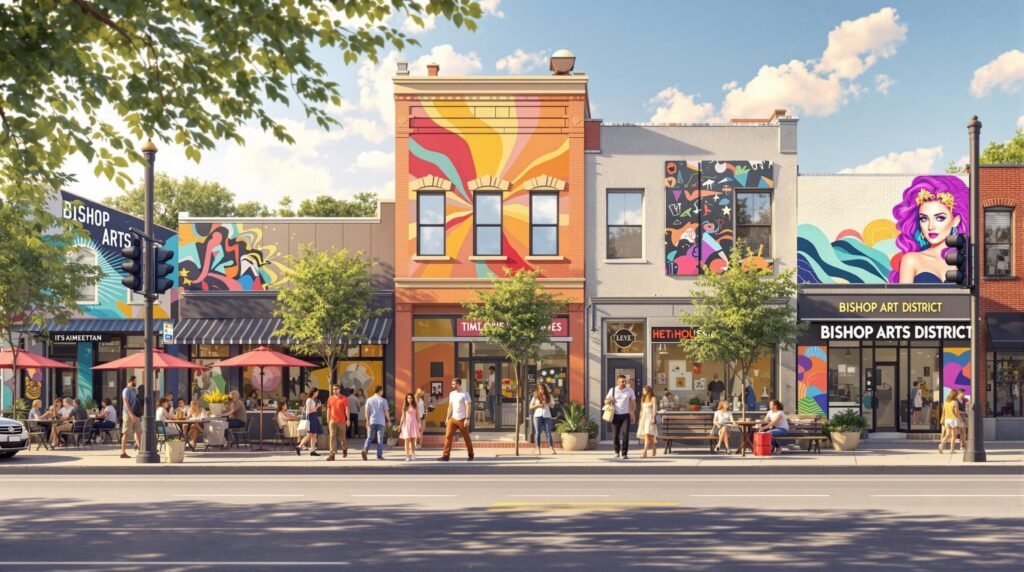 Bishop Arts District: A hip neighborhood filled with indie boutiques, art galleries, and diverse eateries. The Bishop Arts District is a shopping and entertainment district in North Oak Cliff, Dallas, Texas, near the intersection of N. Bishop Ave and Davis Street